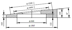 三偏心金屬硬密封蝶閥的密封面是斜錐面,閥體密封圈(圖1)與蝶板組合件密封圈(圖2)的接觸為面接觸,其工作原理是靠驅動裝置扭力直接帶動蝶板組合件,使蝶板組合件密封圈與閥體密封圈充分接觸后產生彈性變形而密封。三偏心金屬硬密封蝶閥作為一種高性能閥門,具有耐腐蝕性好、密封可靠、開啟力矩小等優點。三偏心硬密封電動蝶閥DN1200,其中閥體密封圈材料為1Cr18Ni9Ti,蝶板組合件密封圈材料為復合的不銹鋼板與石棉板夾層組合件,閥體密封圈與蝶板組合件密封圈的加工質量直接決定蝶閥密封性能。
