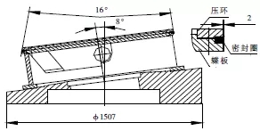 蝶板組合件起密封作用的零件是密封圈,密封圈為斜錐結構,其錐頂角為16°,厚度為13.5mm,由5層石棉板及4層不銹鋼板復合而成(圖6)。密封圈必須與蝶板和壓環等組裝在一起,加工時才能防止密封圈夾層中的不銹鋼板及石棉板翹曲變形。根據其結構特點,對蝶板組合件密封圈采用以下加工方法:(1)先在2.5m立車上分別把蝶板和壓環上的各止口加工到圖紙要求尺寸,外圓不加工;(2)按圖紙要求對壓環鉆孔,蝶板鉆孔攻絲;(3)壓環、密封圈和蝶板按圖紙裝配,將蝶板組合件工裝用螺栓緊固在閥體工裝上,然后再將蝶板組合件裝夾其上。立車刀桿旋轉8°車壓環、密封圈和蝶板至磨削尺寸;⑷用同樣厚度鋼板替下密封圈,車壓環、蝶板各錐面至圖紙尺寸;(5)工裝不動,將壓環、密封圈、蝶板重新按要求組裝,然后在立車刀架上裝磨頭,對密封圈進行磨削處理,使其達到圖紙設計粗糙度要求。